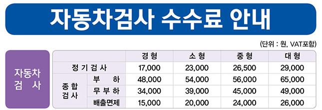 예약을 위해 차량의 정보입력 및 약관 동의를 해야 하며 다음으로 검사소와 예약일자를 선택하면 됩니다. 그리고 결제를 하게 되면 예약이 완료되게 되는데요. 정기검사 및 종합검사에 따른 비용은 경형 및 소형, 중형, 대형으로 구분되어 아래와 같이 나오게 됩니다.
