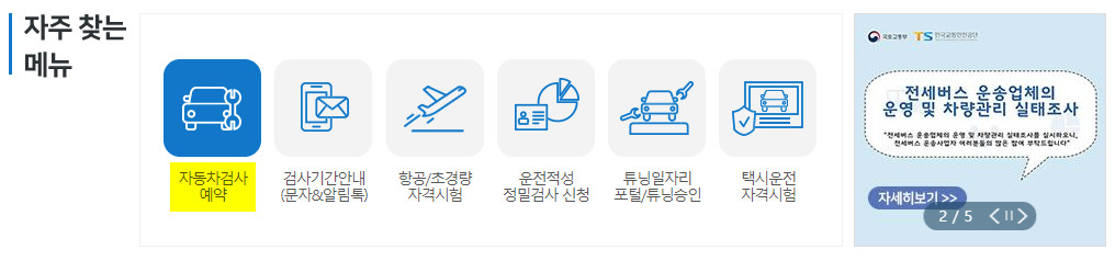 이는 수도권(서울, 인천, 경기) 및 광역시(대구, 부산, 광주, 대전, 울산), 기타도시(청주, 천안, 전주, 포항, 창원, 김해시)라고 보면 되는데요. 차량검사기간 조회 같은 경우 TS한국교통안전공단 홈페이지를 통해 간단히 진행할 수 있습니다. 사이트 메인 화면에 보면 자주 찾는 메뉴를 볼 수 있는데 자동차검사예약을 선택하면 됩니다.