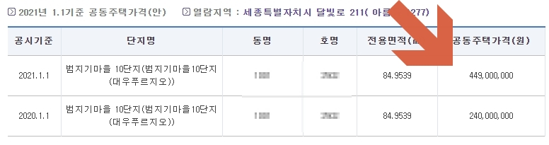 예를 들어 세종특별자치시 아름동에 있는 범지기 마을 10단지 대우 프로지오 아파트를 조회해 보았습니다. 동과 호수를 지정할 수 있는데 2020년에 공시지가는 2억 4천만 원이였던 것이 2021년에는 4억 4천9백만 원으로 변동되었다는 것을 확인할 수 있습니다.