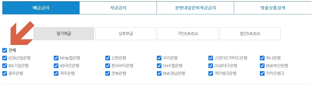 기본적으로 예금금리 - 정기예금으로 선택이 되어 있을 텐데요. 다음으로 은행을 선택할 수 있는데 특정 금융기관을 원한다면 별도로 선택해 주시면 되며 그렇지 않다면 전체에 체크한 뒤 진행하면 됩니다. 그리고 이자 계산방식 및 정렬 방식을 선택한 뒤 검색 버튼을 누릅니다.