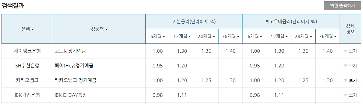 단리 기준으로 12개월로 내림차순으로 검색해 보았더니 관련된 상품이 정렬되어 나오는 것을 확인할 수 있습니다. 은행 및 상품명이 나오며 기본 금리 및 최고 우대금리도 알 수 있고 상세정보를 이용하여 상품의 추가적인 내용도 조회할 수 있습니다.