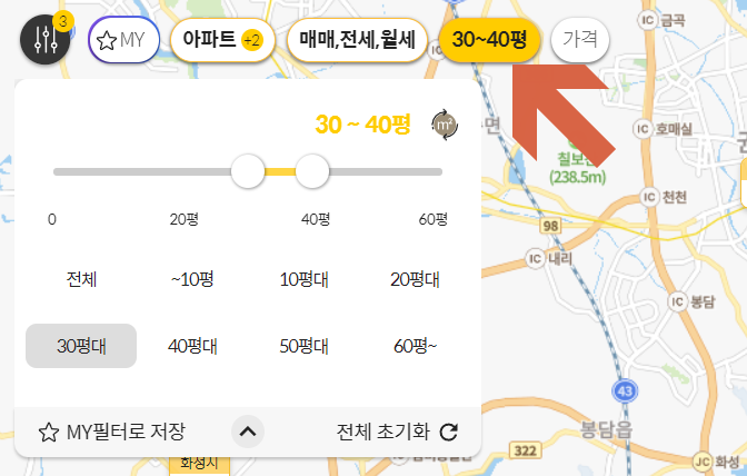 동탄지역 아파트 중 30평을 확인하기 위해 면적 메뉴를 이용하여 30평대로 설정한 뒤 검색하면 되며 추가로 매매나 전세, 월세 중 원하는 항목을 선택하면 원하는 매물을 더 빨리 검색할 수 있습니다.
