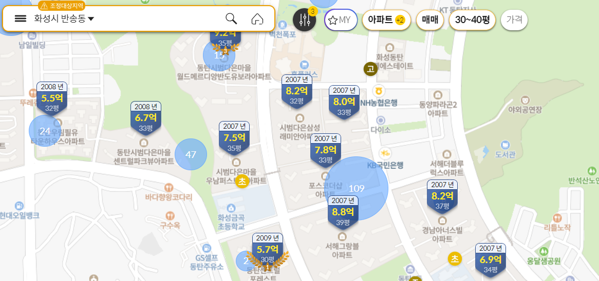 매매 및 전세, 월세 가격을 제공하는 곳은 다양한데 kb국민은행에서는 부동산 메뉴를 두어 다양한 서비스를 제공하고 있습니다. 접속해 보면 지도와 함께 지역을 검색할 수 있는 검색창이 있는 것을 볼 수 있는데 경기도 화성시를 선택한 뒤 반송동, 석우동, 동탄면 등의 세부 지역을 고르면 됩니다.