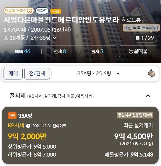 화성시 반송동을 선택하여 확인해 보았는데 매매만 설정한 뒤 30~40평으로 조건을 설정하고 검색을 해 보았습니다. 아파트의 평형과 매매 가격을 한눈에 확인할 수 있는데 아파트명을 선택하면 추가 정보를 얻을 수 있습니다. 시범다은마을 월드메리디앙반도 유보라 아파트를 선택해 보니 동별 매물을 확인할 수 있고 최근 실거래가를 확인할 수 있습니다. 현재 35A평 기준으로 KB시세는 9억 2천만 원이라는 것을 알 수 있네요.