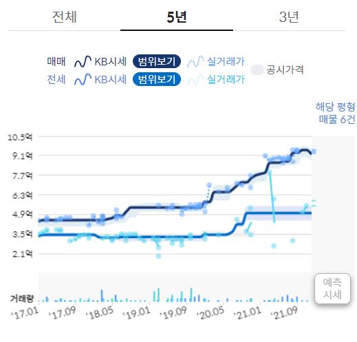 3년 또는 5년, 전체를 선택하여 매매 및 전세 실거래가, 공시가격을 그래프로 확인할 수 있습니다. 전체로 확인해 보았을 때 2020년 하반기까지는 박스권으로 움직이다가 그 이후 급속도로 가격이 상승했다는 점을 확인할 수 있습니다. 이는 단순히 반도유보라 아파트에만 해당되는 사항이 아니라 전국적으로 가격이 올랐다는 점을 알 수 있는데 6억 원 정도 하던 매매 가격이 현재 9억 원이 넘는 가격으로 거래된다는 점이 확인할 수 있네요.
